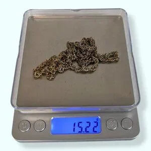 This vintage chain is made of a gold tone metal and is an infinite chain without an opening. The chain is a rope chain and there is a single jump ring connecting both ends. The necklace has normal wear, including some tone loss on some of the necklace chain edges. Also, though the picture shows the necklace doubled, it is just one long chain.