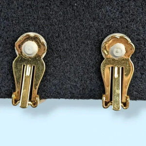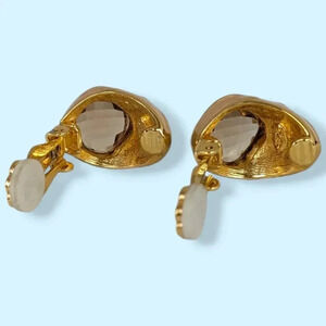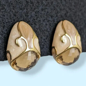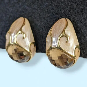 These vintage earrings by Joan Rivers have a really nice, solid feel to them. The earrings are made of a gold tone metal with the exterior being covered in a creamy, swirling enamel (and accented by more gold tone). The earring fronts have faceted stones in a beige/tan tone, which catch the light beautifully. The backings are clip on and have a white rubbery cushion original to the earrings. The inside is stamped Joan Rivers on the upper interior, and PERU on the lower interior. These earrings have some signs of wear and time but are in great shape overall.