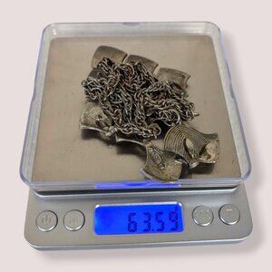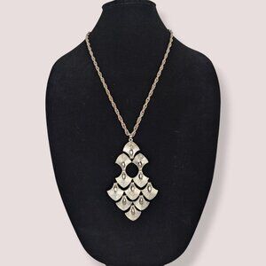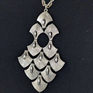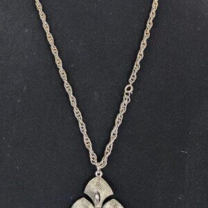 This vintage necklace is made of a silver tone metal and has a c clasp closure. The chain is a rope chain with a good length, though it has some tone change in about 1/3 of it. For that reason, the necklace is priced as if it's only a pendant, the chain being a bonus. The pendant is made up of linked spade-shaped pieces, forming a shape similar to a fleur-de-lis. The pendant has normal wear, but the chain is the only part with visible issues.