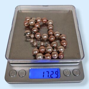 This vintage necklace is beaded and has an adjustable hook closure made of a silver tone metal. The necklace is strung with spherical faux pearls in peach and pink pastel tones that feel like they're made of plastic. Rather than spacer beads, the necklace has small coils of thin wire, which is a nice touch I haven't seen often. The necklace is choker length, so please be sure you know the minimum necklace length you need! The piece has normal wear and there is about a bead worth of space on the string, but no issues affecting wearability beyond the length.