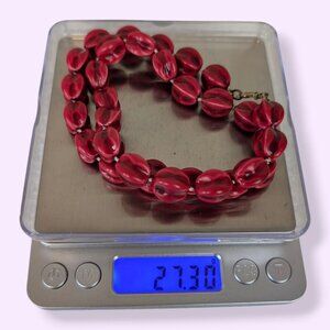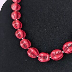 This vintage necklace is beaded and has a gold tone metal c clasp closure. The beads have a slightly richer pink tone than what shows up in the pictures, which is slightly more red. Each bead is detailed similarly, and I'm not sure of the best way to describe this, but it looks like a candy that someone bit down on with their molars, rotated, and bit again, but not in a gross way. I know, right? There is a small spacer bead in between each of the larger pink beads. The necklace has some wear but there are no real bite marks, and no issues that affect wearability.