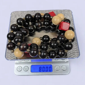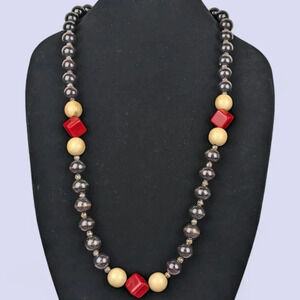 This vintage necklace is a long string of wooden beads. The beads are primarily round and black with knots between each one, and there are three accents of a red cube bead with a round beige bead on either side. This necklace is worn long but may be long enough to double.