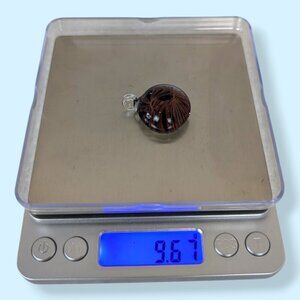This vintage pendant is made of Murano-style art glass and has a little bail built in. The glass in smooth, rounded, and clear near the surface. Deeper in the pendant you can see what look like long, pulled red tone strands swirling with a dark blue background. The back of the pendant is clear and flat. There is some wear but nothing that affects wearability. There are no cracks, chips, or breaks.