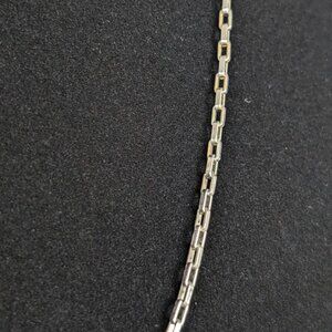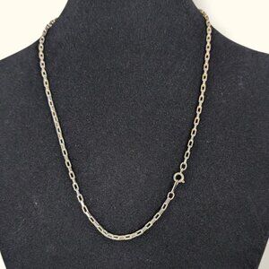 This vintage chain is made of a metal that was originally gold tone (and still is inside the links) but has faded to silver tone. The paperclip chain is made of links that are short, rectangular, and fairly tightly linked. Aside from the gold inside/silver out and normal wear, this necklace does not have issues.