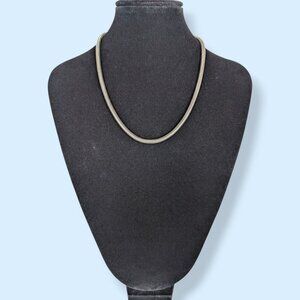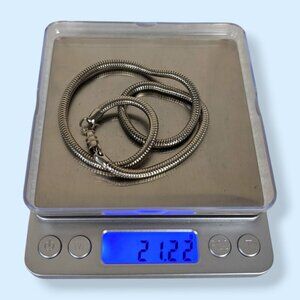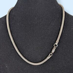 This vintage snake chain is made of a silver tone metal and has a barrel clasp closure. The chain is a nice thickness and is tightly linked. There is some normal wear, but no issues affect wearability.