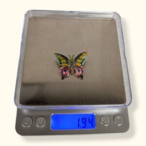 This vintage brooch is made of gold tone metal and has a modern locking c pin closure. The brooch is shaped like a butterfly and is coloured brightly with a delicious sugary finish. There is tone loss in the clasp and around the back, but the only non-perfect aspect of the front is the small white mark on the left wing just above where the top and bottom wings split. The butterfly is stamped KOREA on the backing.