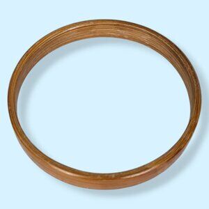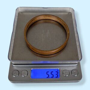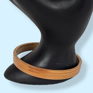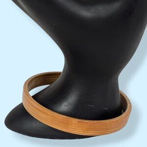 This vintage bracelet is made of wood and is in a fixed shape without an opening. The wood is a lighter tone and has a horizontal grain that runs all the way around the bracelet. Though it has a pretty natural appearance, there appears to be a thin coating on it that makes the wood smooth and nice to wear. There is normal wear, but no issues affecting wearability.