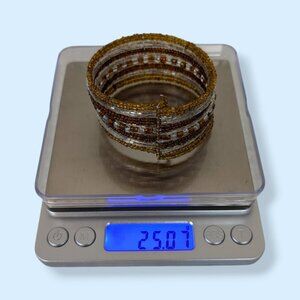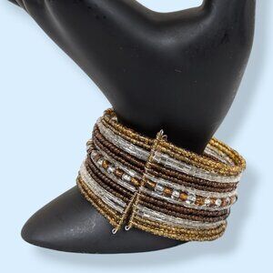 This bracelet is made of silver tone wire and 10+ layers of small beads. The bracelet features amber tone beads on the edges, with alternating layers of silver/clear and brown beads. The bracelet has an opening that overlaps itself slightly, and the wires in the bracelet move back into position well. The bracelet has some wear but nothing that affects wearability.