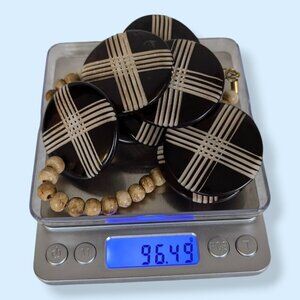 This necklace is beaded and has a hook closure made of a gold tone metal. The necklace has small light tone wooden beads from the clasp towards the front. The front of the necklace features 9 large, round, fairly flat disc beads that feel like they're made of wood. They're stained dark with decorative X marks on both sides. There is normal wear throughout, most visible as tone loss in the wood. Fortunately, since both sides of the necklace are the same, it can be flipped to whichever side you prefer.