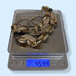 This necklace is made of a gold tone metal and has an adjustable lobster clasp closure. The necklace features two tight link snake chains on either side from the clasp towards the front. The front section of the necklace is made of chunky (plastic) gold tone links that are woven with a thick doubled beige cord and smaller thin cords in black, brown, grey, and green. There are also two thinner chains woven in, one in gold tone and one in a black tone. The necklace has normal wear, most visible as superficial marks in the smooth gold tones, but the piece is still very wearable.