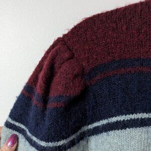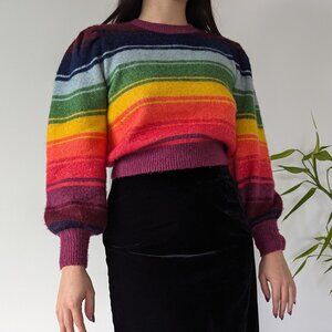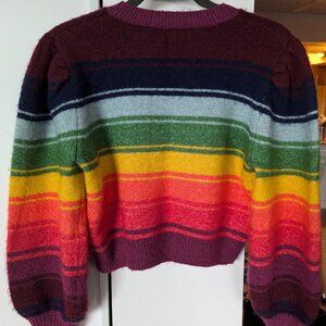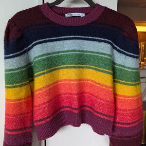It has multicoloured stripes, bishop sleeves and the length is cropped. The sweater is in good condition, size M.