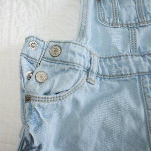 These are the perfect light wash overall shorts for a fashionable baby. They're size 6-9 months and have 2 snaps on each side. They have an elastic waist that is adjustable as well. They have 3 functional pockets in the front and 2 in the back. The insides of the pockets have a floral pattern. There's a design embroidered on the sides of the shorts in the front and back and a raw hem. They're in very good condition.