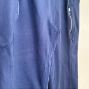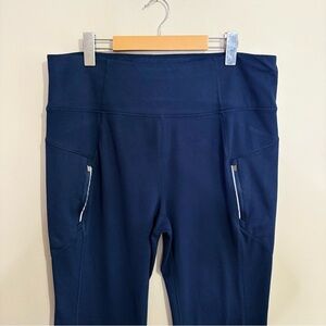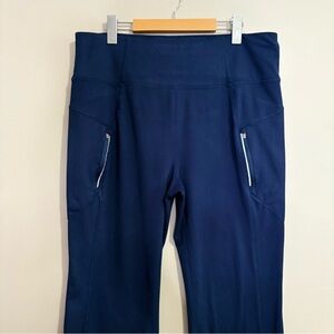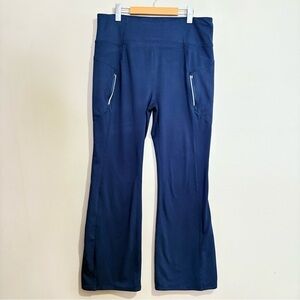 Stylish navy yoga pants featuring flared legs and convenient zipper pockets. Perfect for workouts or casual wear. Minimal to almost no pilling. Only worn 2-3 times.