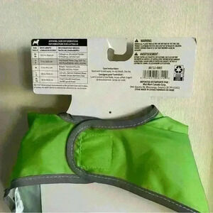 The bright green dog/cat raincoat features a two-point hook and loop closure around pet's chest and stomach with an attached hood. Raincoat is made of water-resistant polyester plain weave fabric with a reflective trim.