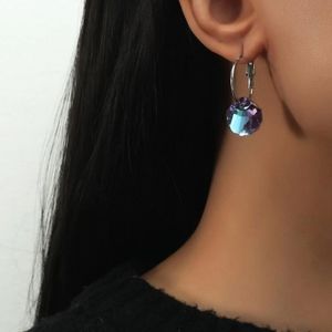 Purple /blue crystal drop earring on a silver hoop. Not real silver. Height is 1 inch and width is 0.5 inches. New but doesn't come with tags.