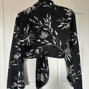 Chic and trendy Dynamite long sleeve tie-front crop blouse in a sleek black and white floral print. Features a collar, wide bell sleeves, and an adjustable tie front for a flattering fit. Lightweight satin-like fabric perfect for nights out, brunch, or vacation looks.