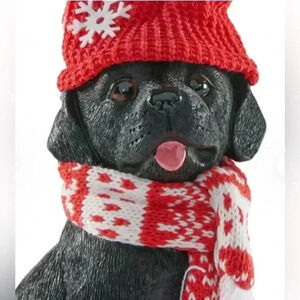 2/$25 Holiday Black Dog w Knit Winter Red Hat and Scarf Figurine Christmas Cute