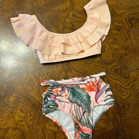 Adorable toddler girl 2 piece swim suit , only had a chance to wear once before it was too small. Small key holes on each side of the bottoms & ruffle on the top is all the way around.