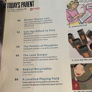 Today's Parent Magazine vintage magazine from March 2001. Contents/articles as shown in picture #2 and 3. No writing or markings on pages. All pages intact. Mark on front cover is from removal of address label. This post is for one item only. Mix and match for bundle price. Colour depends on device/screen settings and lighting in pictures. All items are from my smoke free home.