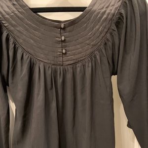 Black BCBG MaxAzria blouse with bell sleeves. 3 button accent on the satin look boat neck collar. 2 satiny lines adorn the bottom of the top. Measurements Approx 22" long x 18" across the chest. Materials 98% polyester, 2% spandex. Barely been worn in great condition.