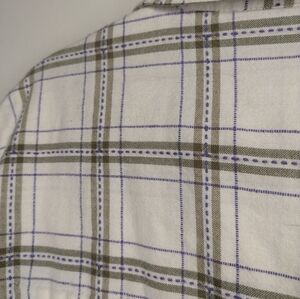 Vintage 90s Plaid Button-Up Shirt – Soft neutral check with subtle lavender embroidery, short sleeves, relaxed fit. Perfect tied at the waist for boho western festival vibes or worn loose for casual cottagecore charm.