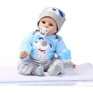 * Reborn accessories:She comes in a collector's gift box. She is accompanied by a 6-piece baby doll gift set including:blue jumpsuit *1;baby bottle*1;Magnetic dummy*1;Birth certificate*1;blanket*1;Diapers *1.
