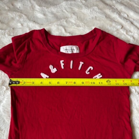 Abercrombie & Fitch Long-Sleeve Crew-neck Shirt in very good pre-loved condition. Red in colour with white raised letters on front. . Ladies Juniors Size Small. Shirt has a small thread pull, see last picture. Shirt is 100% cotton, machine wash cold. This post is for one item only. Mix and match for bundle price. Colour depends on device/screen settings and lighting in pictures. All measurements are approximate and may slightly vary. Measurements are taken by hand with item laying flat and unstretched. All items are from my smoke free home.