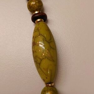 - gold tone chain with gold tone spacer beads, wooden disc beads with round and conical chartreuse beads
