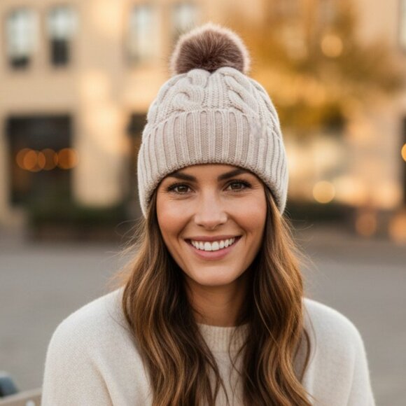 Stay cozy and stylish with this chic knit hat featuring a classic cable knit pattern. The hat is adorned with a fluffy pom-pom on top, adding a playful touch to its elegant design. Perfect for cold weather, this accessory keeps you warm while complementing your winter wardrobe. Its versatile beige color makes it easy to pair with any outfit, making it an essential addition to your seasonal accessories.