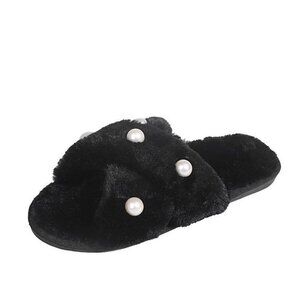 2/$30 Black Faux Fur Pearl Slides Fuzzy Cross-Band Slippers Women’s Plush Shoes