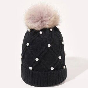 Add a touch of cozy glamour to your winter wardrobe with this stunning black knit beanie. It features a classic cable-knit pattern, a plush faux fur pom-pom, and elegant pearl accents throughout. This hat is the perfect accessory to keep you warm while making a chic statement.