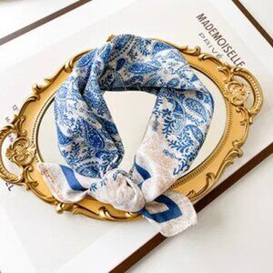 TAGS: Paisley scarf, blue and beige scarf, silk scarf, square scarf, headscarf, neck scarf, women's scarf, versatile accessory, classic print, chic, timeless, handbag accessory.