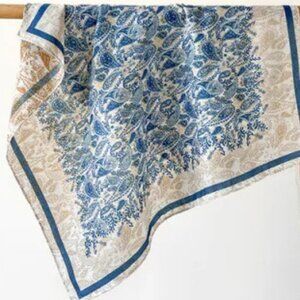 Elevate your style with this exquisite square scarf featuring an intricate blue and beige floral pattern. The design showcases delicate botanical motifs bordered by a blue edge, adding a touch of elegance to any outfit. Versatile in its use, this scarf can be effortlessly styled around the neck, as a headband, or even tied to a handbag. Perfect for enhancing both casual and formal attire, this accessory combines beauty and function, making it a must-have addition to your collection.