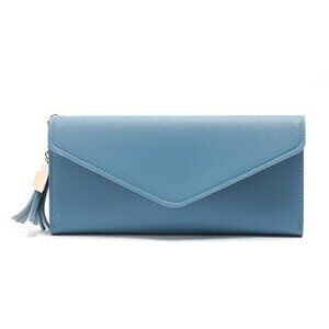 This stylish and elegant wallet features a sleek design with a soft blue colour, making it a versatile accessory for everyday use. It includes a secure snap closure and is accented with a chic tassel and heart charm in gold, adding a touch of sophistication. With multiple compartments for cards and cash, this wallet is both practical and fashionable, perfect for organizing essentials with ease.