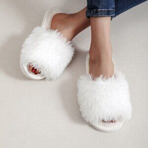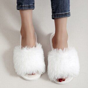 2/$30 Fluffy Plush Open Toe White Winter Slippers Slip On Flat Non Slip Women