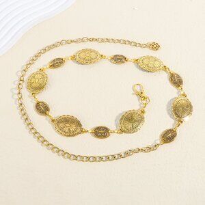 Elevate your outfit with this stunning gold chain belt, featuring intricately detailed medallion designs. The belt adds a luxurious touch, perfect for accentuating the waist and enhancing any ensemble. The elegant chain drapes gracefully, offering a sophisticated and modern flair to both casual and formal looks.