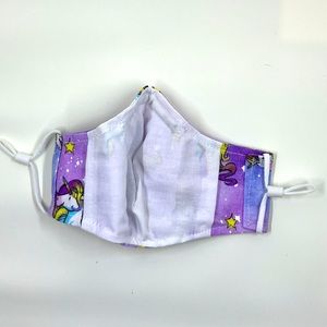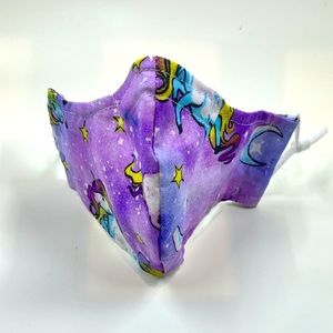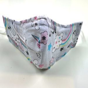 Handmade unicorn face masks. 100% cotton fabric. Inner lining made from breathable Muslim cotton fabric. You can place a filter inside for added protection if needed. Adjusts at ear for proper fit. Wire at nose so it can be pinched and molded to face for better protection. Size 4-8 years.