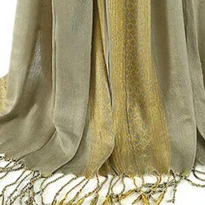 Elevate your style with this elegant scarf featuring a luxurious drape and delicate fringe detailing. The shimmering gold accents complement the khaki hue, offering a versatile accessory that enhances any outfit. Perfect for adding a touch of sophistication to your ensemble, this scarf transitions seamlessly from casual to formal settings. Wrap yourself in its refined charm and enjoy the blend of comfort and style it provides.