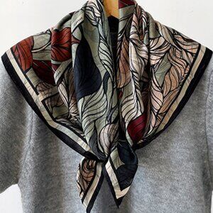 TAGS: Silk scarf, leaf print, square scarf, autumn scarf, floral scarf, headscarf, neck scarf, luxury scarf, fall fashion, versatile accessory, women's scarf, handbag accessory.