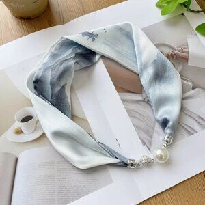 TAGS: pearl detail scarf, watercolor silk scarf, modern neck scarf, minimalist fashion accessory, blue gray scarf, elegant neck tie, small silk scarf, satin pearl necklace scarf, chic neckwear, luxury style scarf, classy women’s scarf