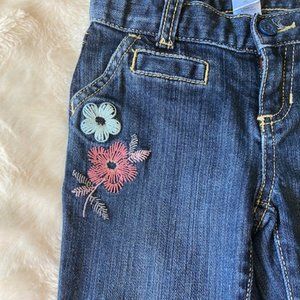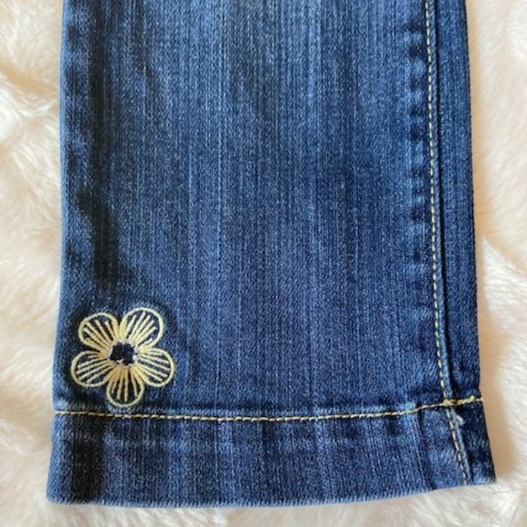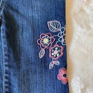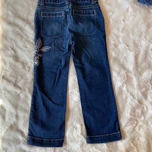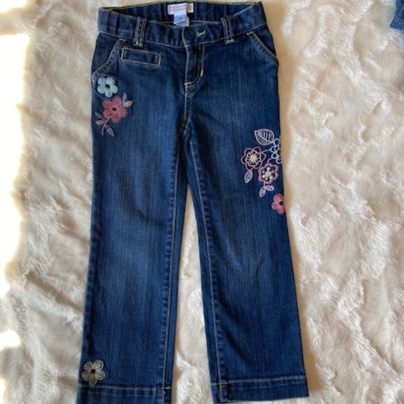 Old Navy Denim Jeans in very good pre-loved condition. Jeans are blue denim with pretty embroidered flowers. Jeans have adjustable waist, zip closure with button at waistband. Jeans have 2 side pockets at front and 2 fake pockets at back. Made of 98% cotton and 2% spandex. Sizing on tag: 4T, height: 39-42" (99-107 cm), Weight: 36-40 lbs (16-18 kg). Machine wash cold. This post is for one item only. Mix and match for bundle price. Colour depends on device/screen settings and lighting in pictures. All measurements are approximate and may slightly vary. Measurements are taken by hand with item laying flat and unstretched. All items are from my smoke free home.