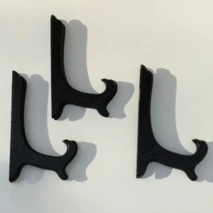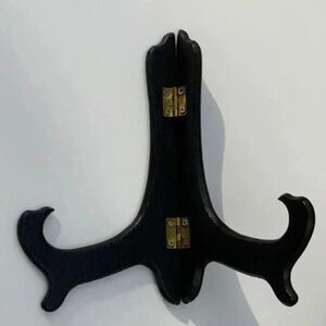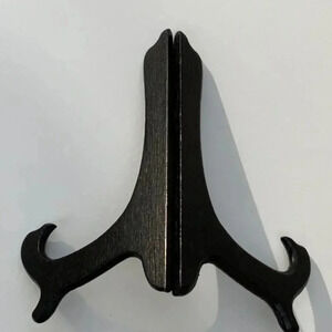 Good quality plate stands. Wooden, painted black. In excellent condition. Some discolouring on one set of brass hinges (see photo). About 7” tall by 4” wide.