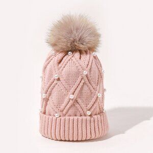 Add a touch of cozy glamour to your winter wardrobe with this stunning pink knit beanie. It features a classic cable-knit pattern, a plush faux fur pom-pom, and elegant pearl accents throughout. This hat is the perfect accessory to keep you warm while making a chic statement.
