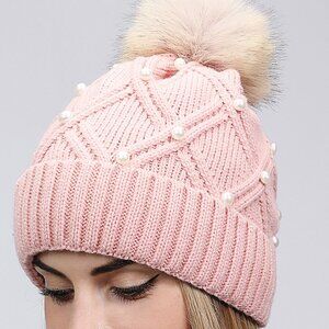2/$30 Pink Stylish Knit Beanie with Faux Fur Pom-Pom & Pearl Embellishments