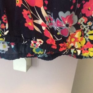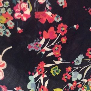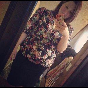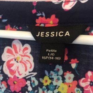 Jessica size large petite - so cute for spring time! Navy with floral pattern, 3/4 length with elastic at hem and sleeves. So flattering! Very light - semi sheer material that does not look see through when wearing