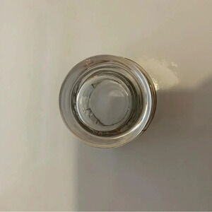 Circular glass votive candle holder with gold threads running through top bulb. Solid base. Smooth edges on top surface. No chips, cracks, etc.