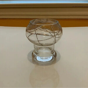 Circular glass votive candle holder with gold threads running through top bulb. Solid base. Smooth edges on top surface. No chips, cracks, etc.