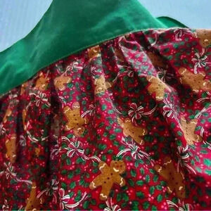 Vintage Christmas apron featuring a red and green colour scheme and Gingerbread Man printed fabric.