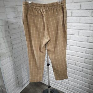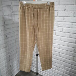 Size Medium Tan & beige checkered Tie & elastic waist 2 front pockets Straight fit Small slit on cuffs 2 back faux pockets 64% Polyester / 32% Viscose / 4 % Elastane Good used condition - some pilling on back side area