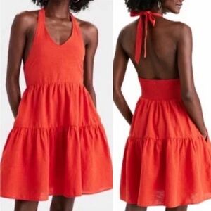 ❤️2/$30❤️[S]American Eagle Bold Orange Red Linen Blend Halter Sun Dress